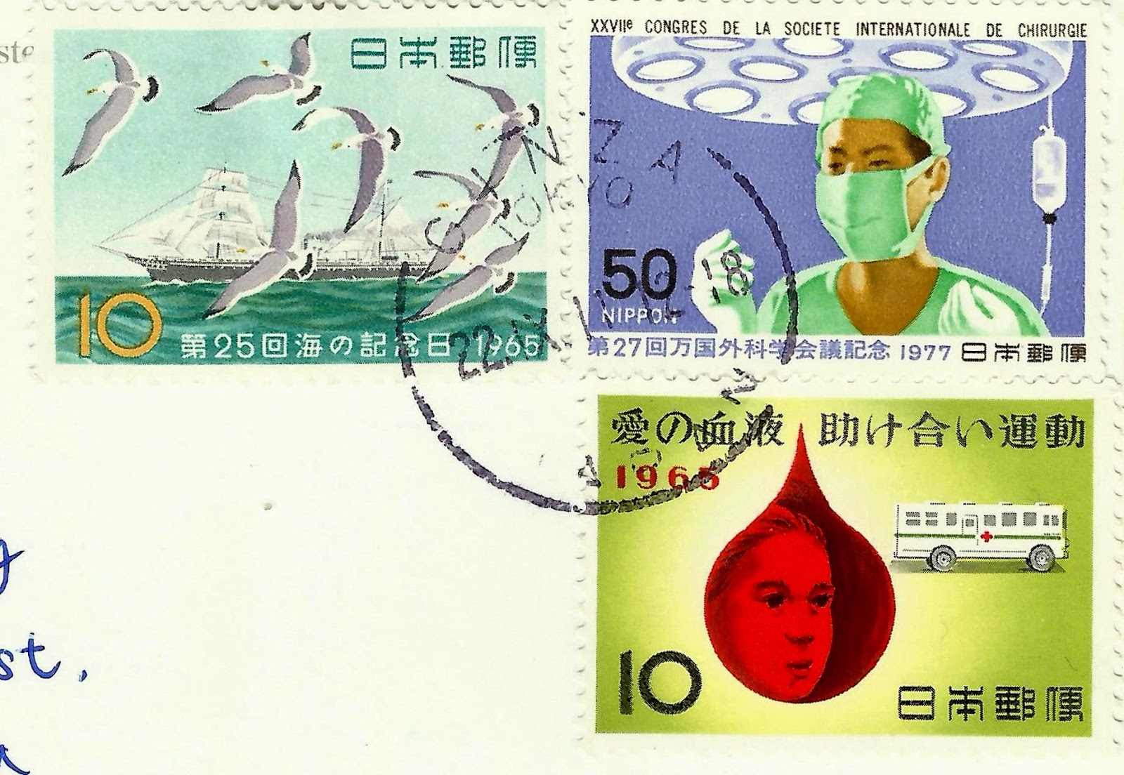 Na kartce czekały na mnie rewelacyjne znaczki. Jeden ze spotkania międzynarodowego chirurgów - bagatela 11 lat przed moimi narodzinami, drugi zachęcający do oddawania krwi. Kompletu dopełniał znaczek z dni morza. Fajne stampsy mają w Japonii.